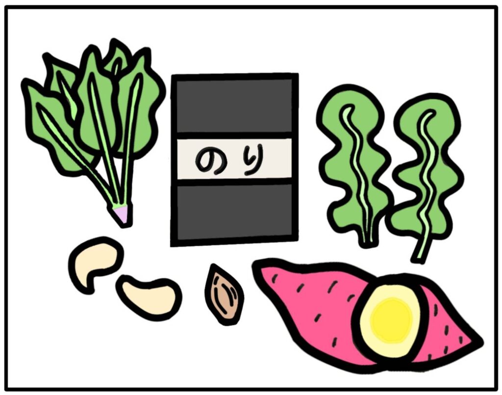 アーモンドやカシューナッツなどのナッツ類に加え、海苔や昆布・ほうれん草・サツマイモなどに多く含まれています。